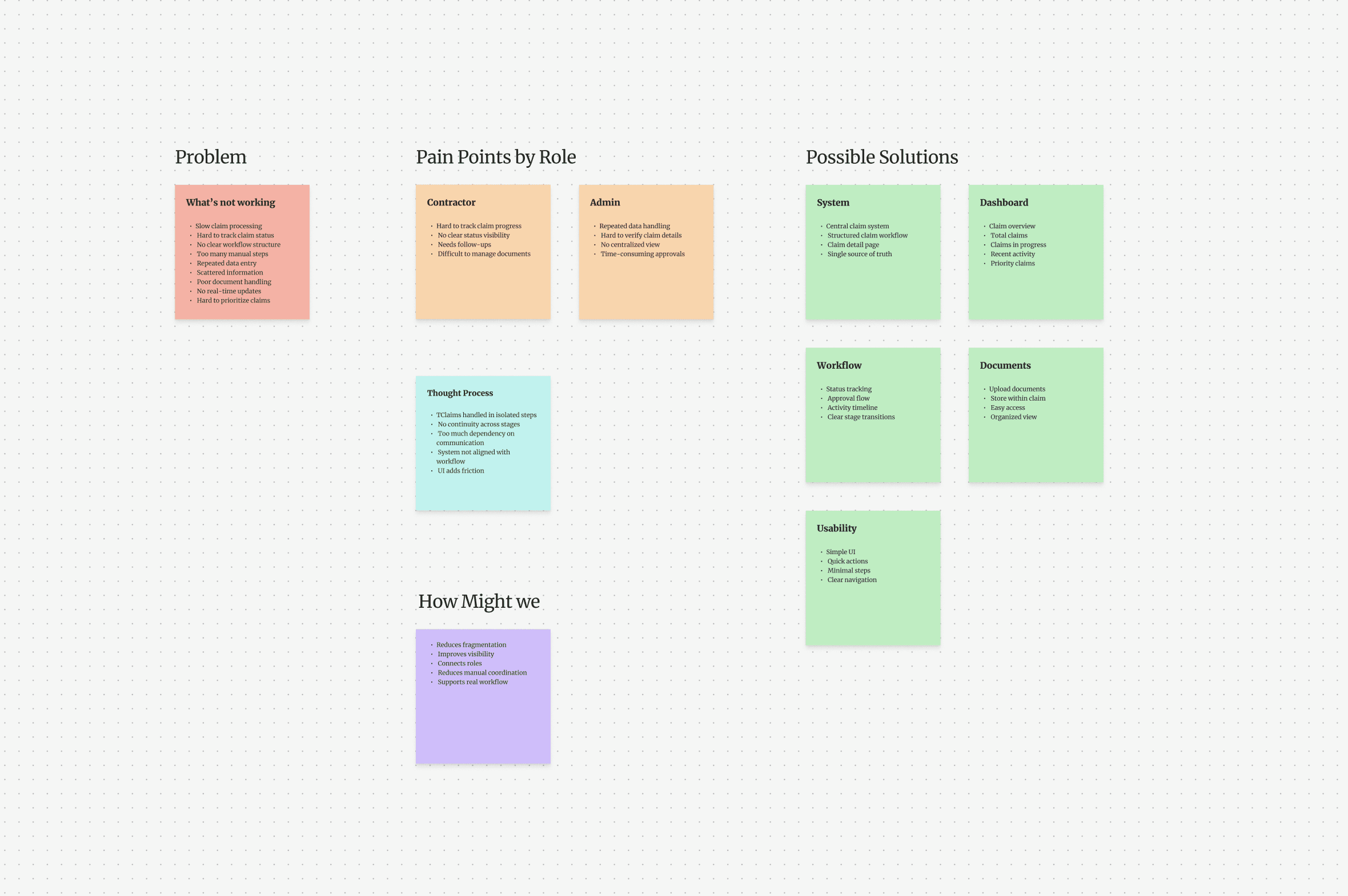 Analyzed how claims were managed across contractors and internal teams, identifying gaps in tracking, coordination, and document workflows.