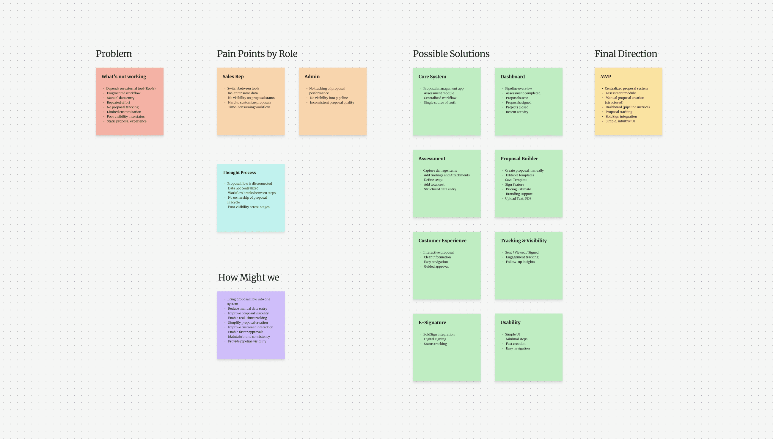 Insights from research and stakeholder sessions reinforced the need for a system that integrates proposal creation into the core workflow.