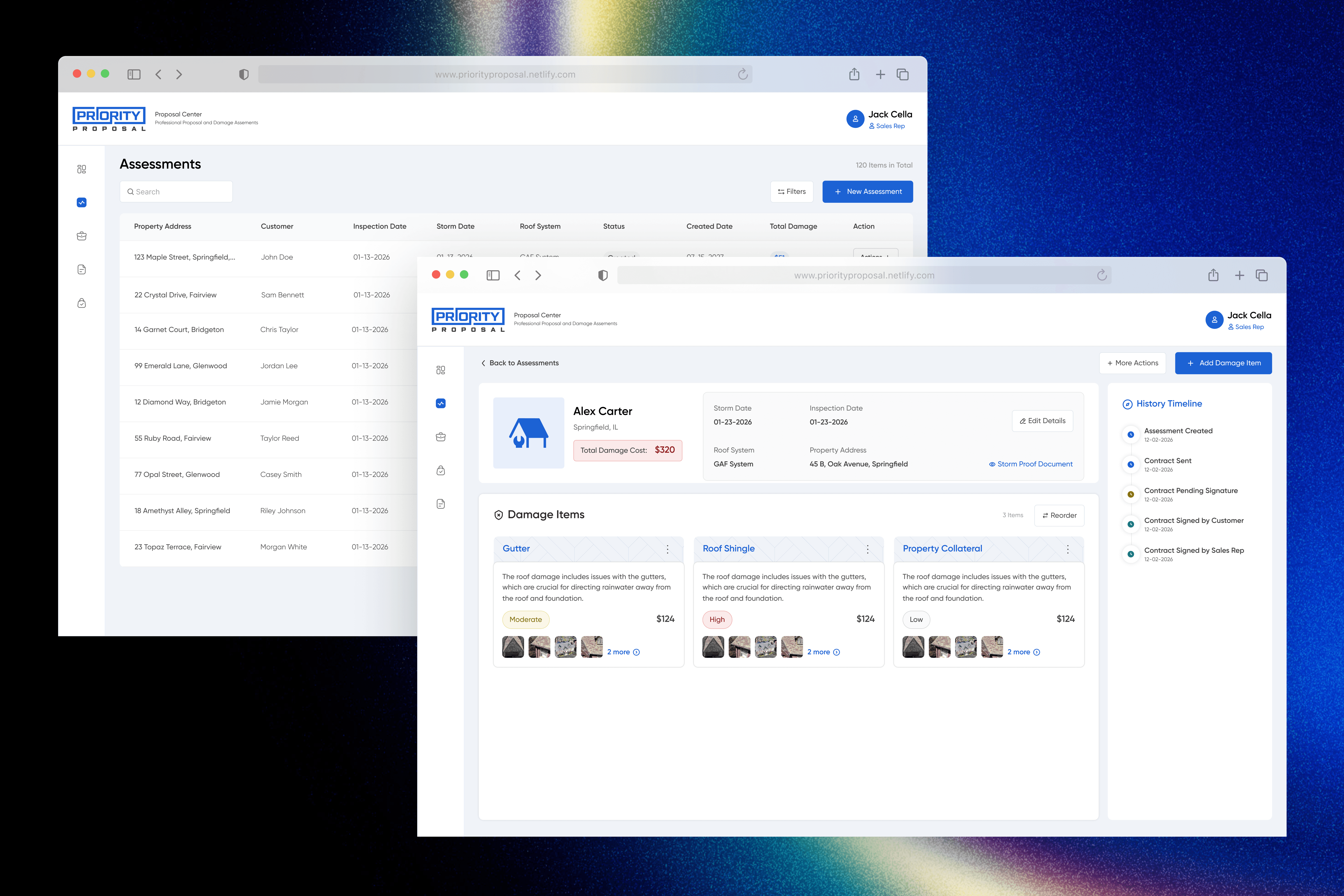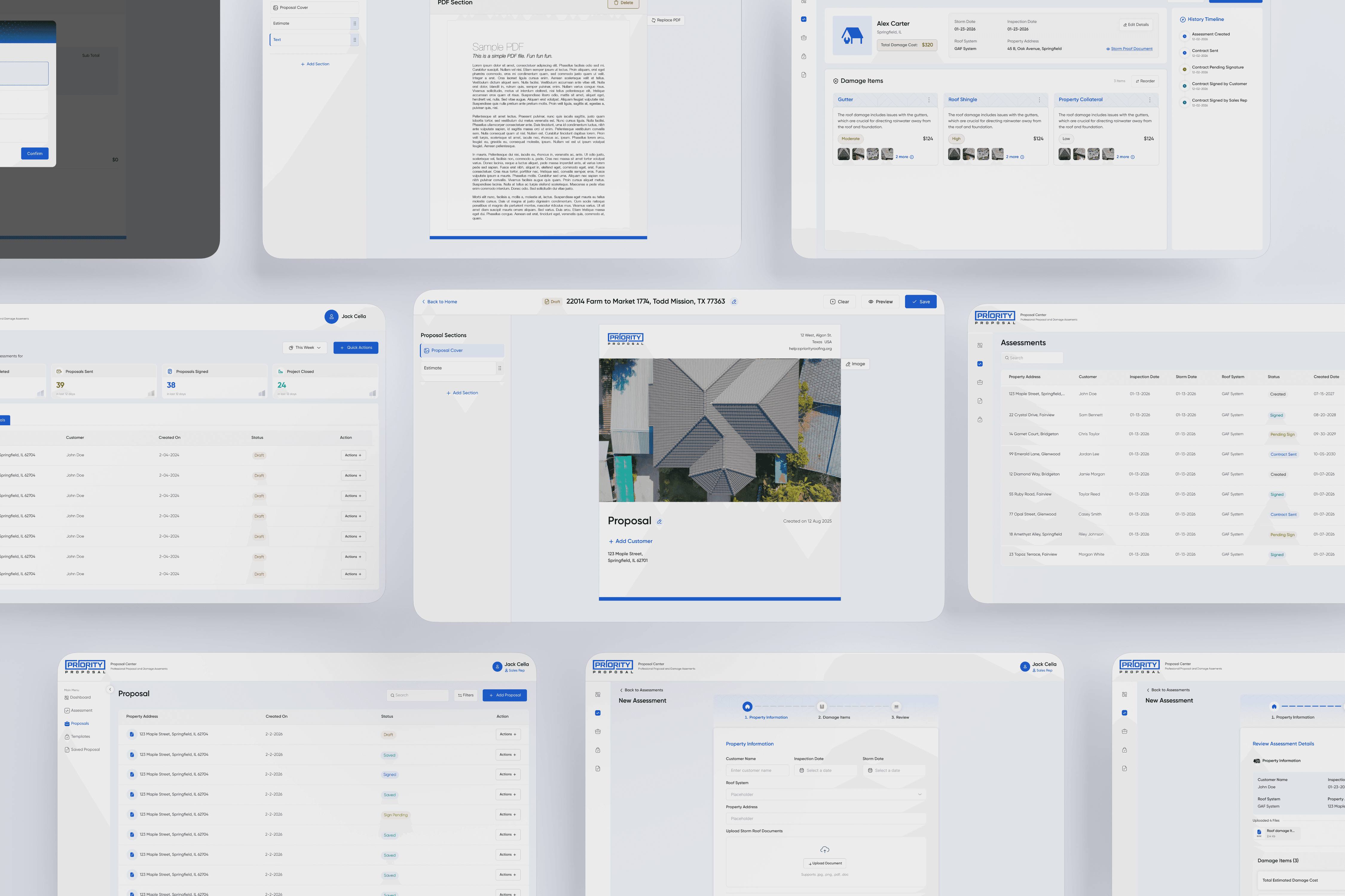 The assessment module was designed to capture all essential information required before proposal creation, acting as the foundation of the workflow. It includes a dedicated contract page where sales representatives document damage items, findings, and the overall scope of work, along with the total estimated cost.