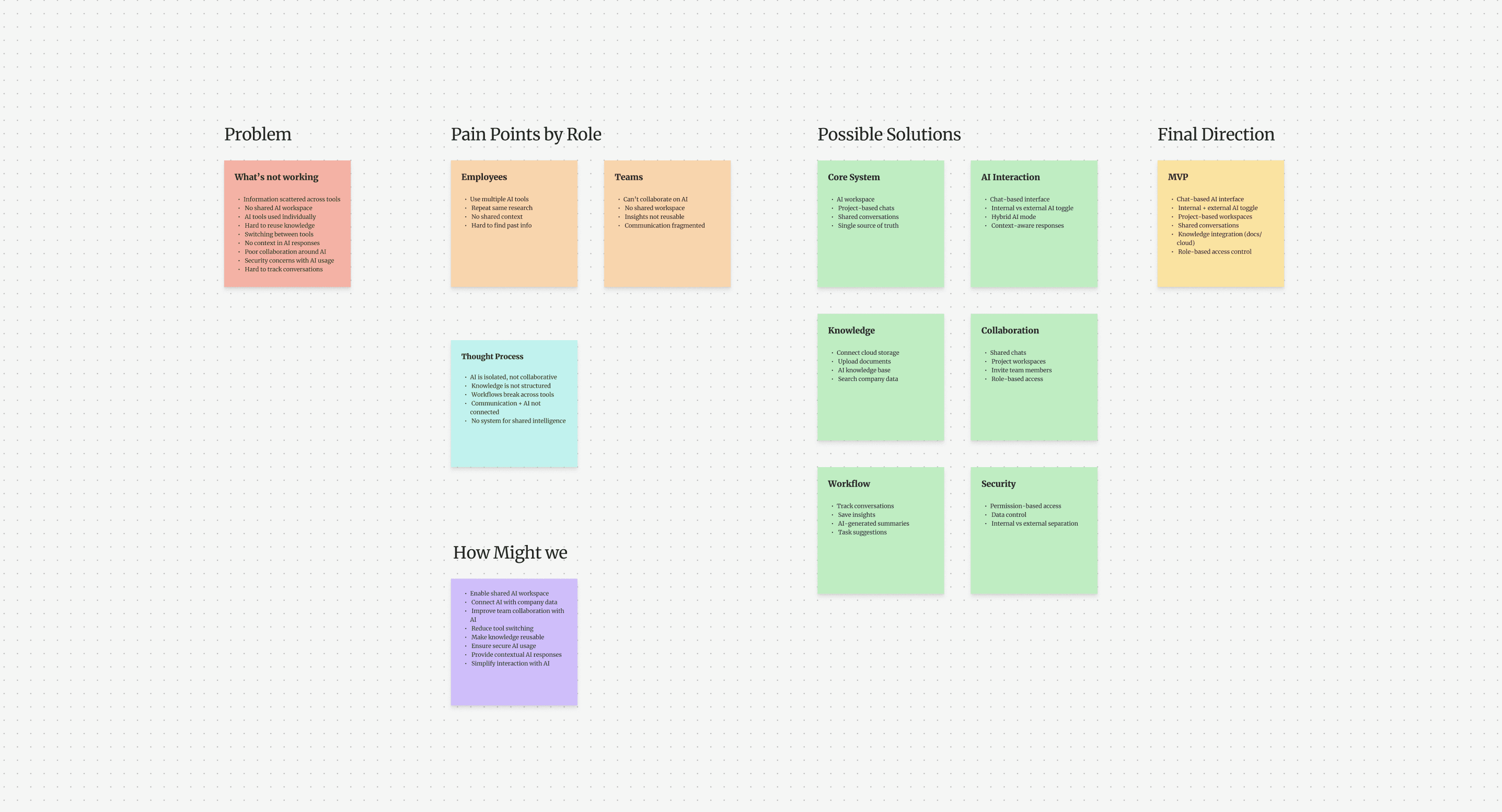 This analysis highlighted that while AI tools, collaboration platforms, and knowledge systems each solve specific parts of the problem, they operate independently. Users often switch between tools to complete a single task, leading to fragmented workflows and loss of context. Additionally, AI interactions are typically individual and not designed for shared, team-based usage.